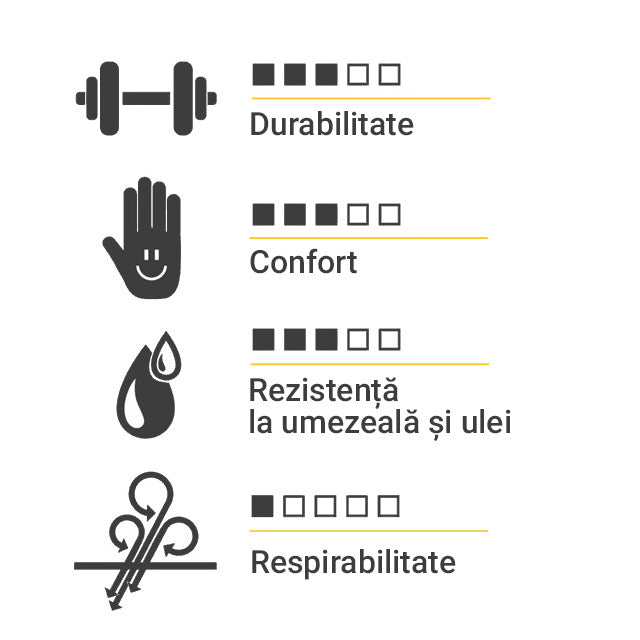 - Acoperire: Nitril 75%, pentru o rezistenta crescuta la ulei si apa.